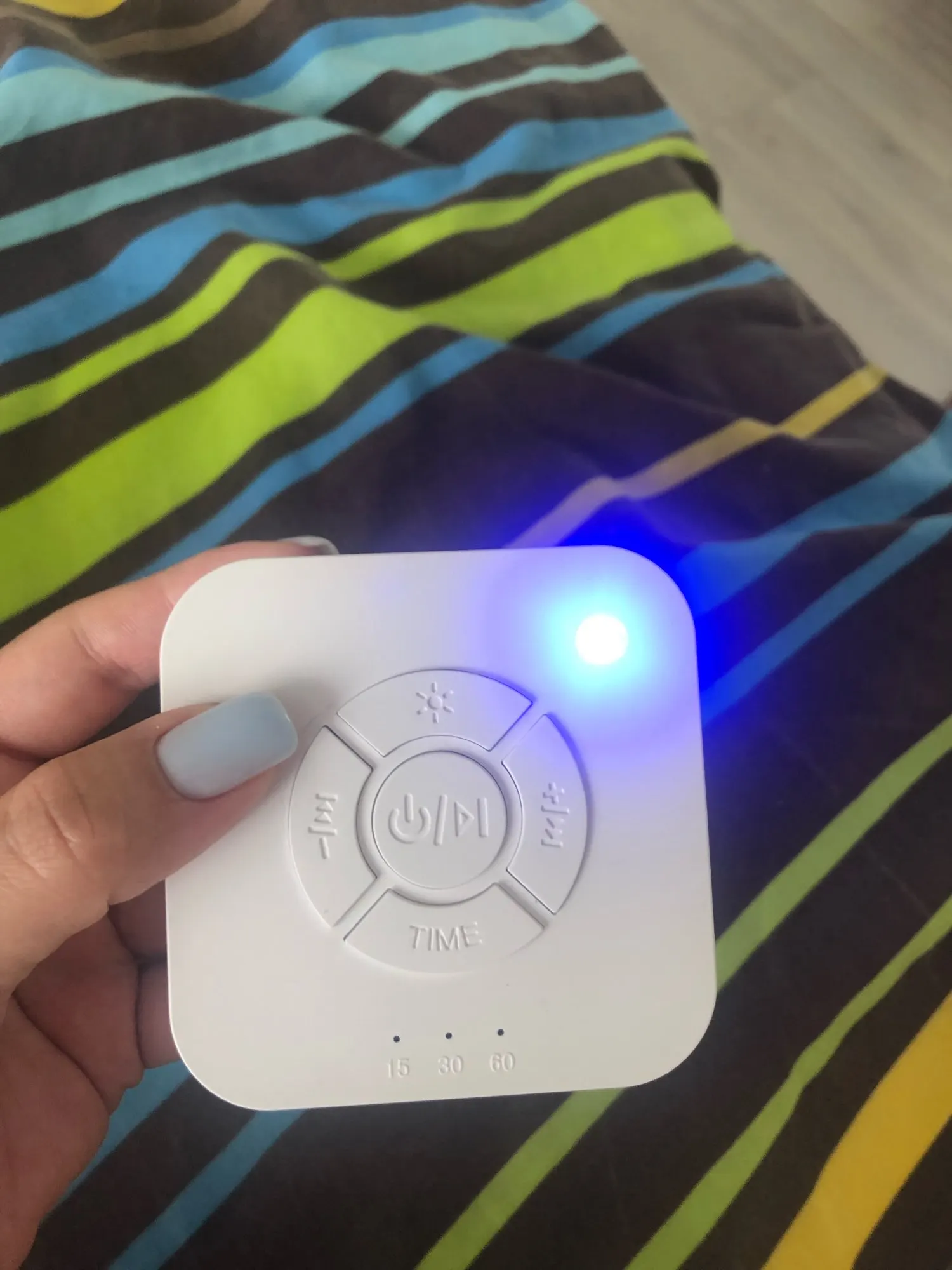 4.Automatic shutdown timer: This white noise machine can be played continuously non-stop all night or there is an auto-off timer to set for 15, 30 or 60 minutes to conserve energy.(light display).